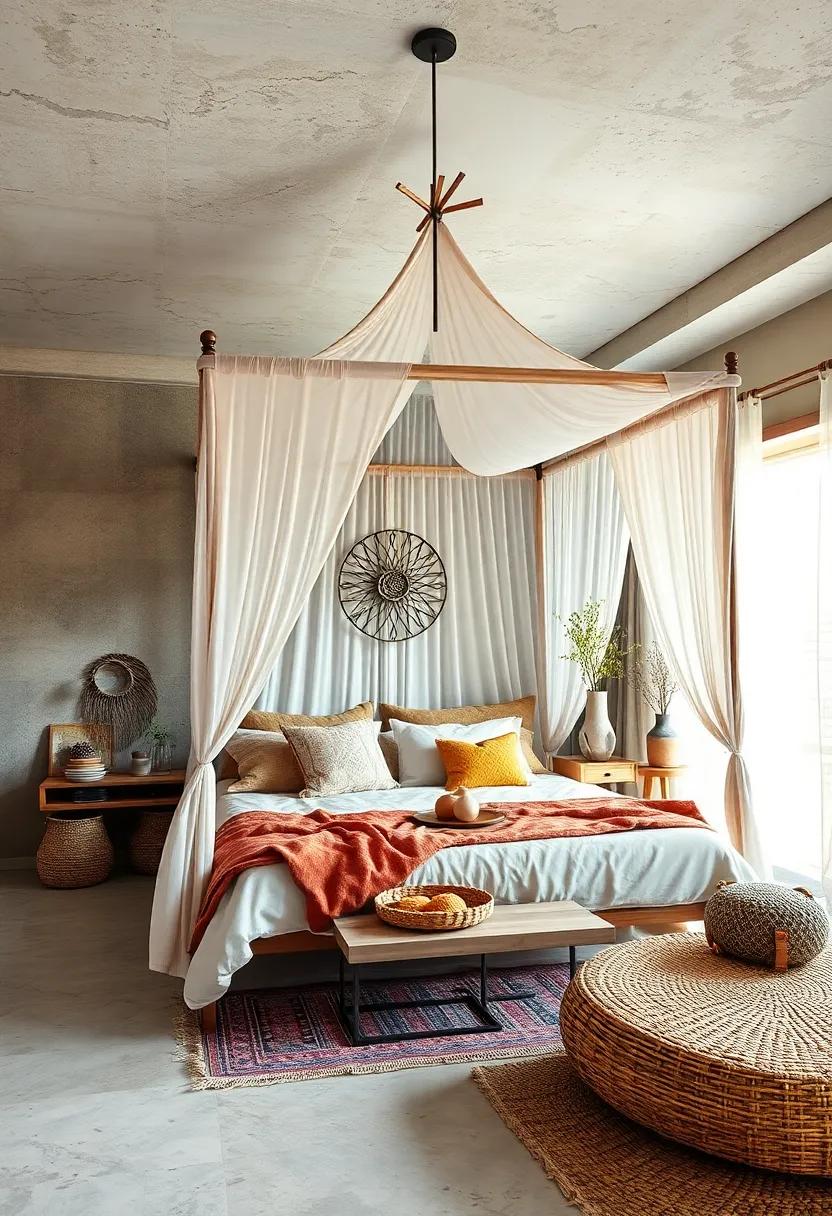 Transform your sleeping area into a dreamy retreat by incorporating a canopy bed adorned with soft, flowing fabrics that sway gently in the breeze.Lightweight sheer curtains, in delicate hues such as whispering white, muted blush, or soft lavender, can provide the perfect ambiance for those early mornings and restful nights. Consider using natural materials like cotton or linen to enhance the airy feel of your space.Choose a frame that resonates with the bohemian spirit—think rustic wood or vintage metal that tells a story while providing a stunning visual contrast to the gentle fabric.
