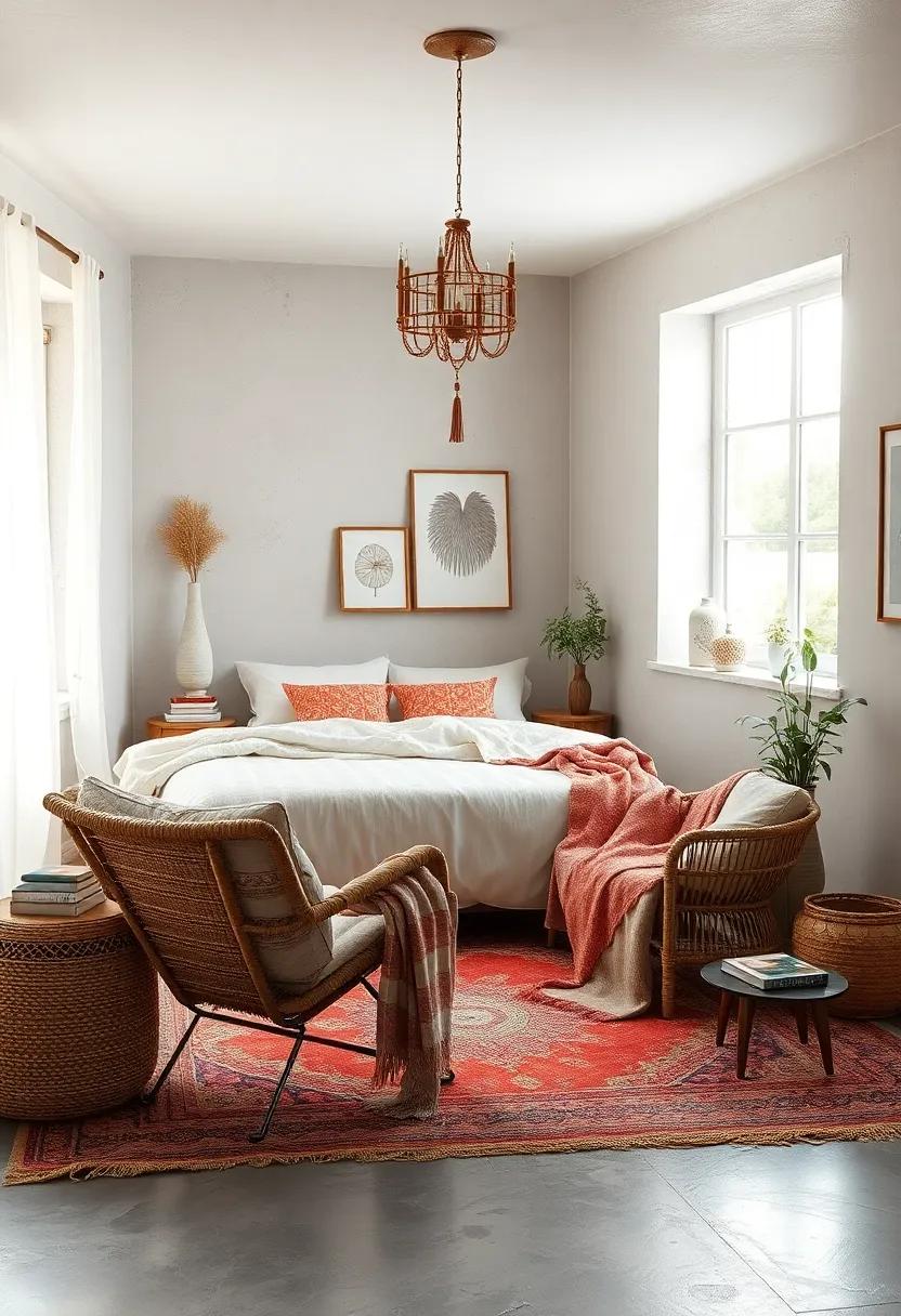 Transform your space into a personal sanctuary by incorporating a comfy chair and a plethora of soft blankets. Choose a chair in a rich, earthy tone or a gentle pastel hue that complements the overall boho aesthetic of your bedroom. A vintage armchair or a rattan lounge chair can add a touch of whimsy and charm. Surround your chair with an assortment of fluffy throw blankets, featuring varying textures, patterns, and colors. Experiment with layering to create a visually enticing and inviting atmosphere, making it irresistible to curl up with your favorite book.