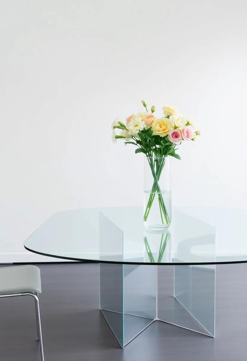 Embrace Minimalism: A sleek, clear glass dining table topped with a single, oversized vase filled with fresh flowers creates an elegant focal point without overwhelming the space