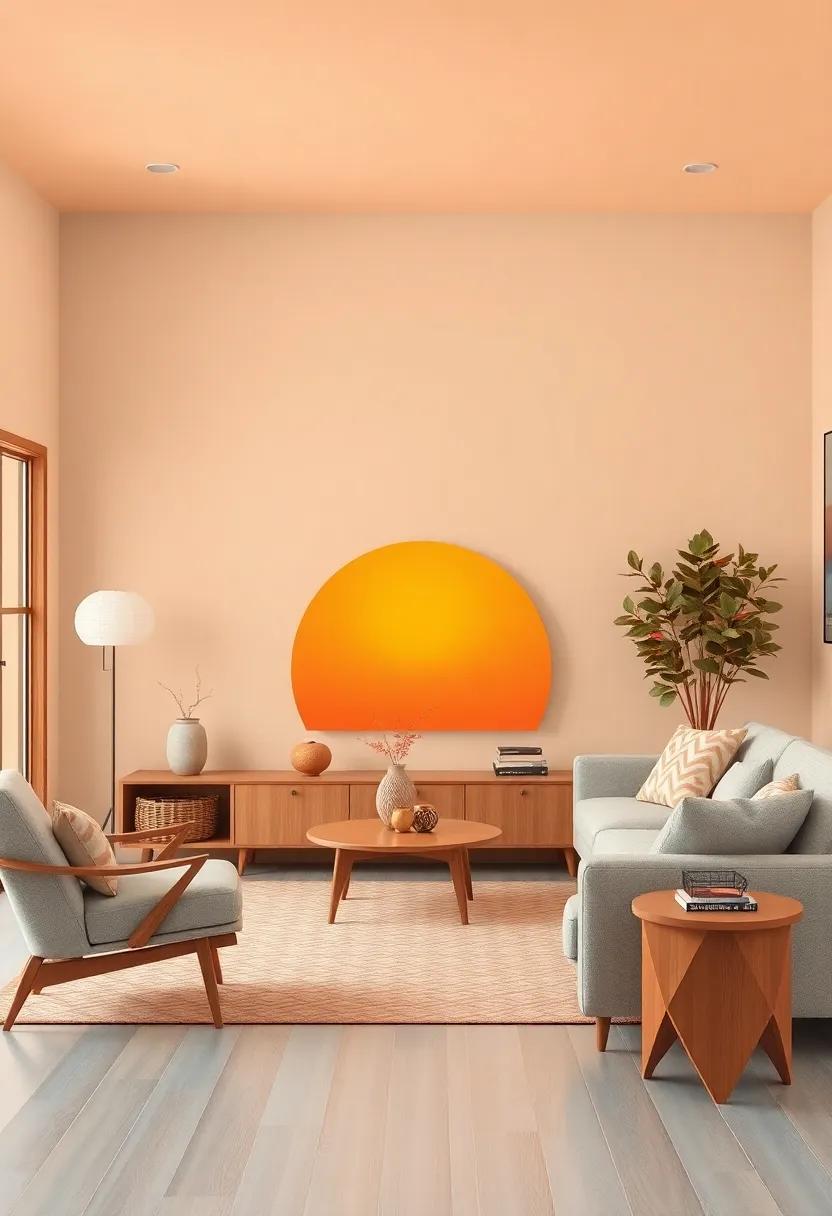 Retro Sunrise: Palette of soft peach, dusty blue, and warm beige brings the warmth of a sunrise to your mid-century living room