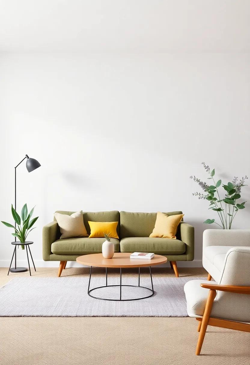 - Furniture: Choose mid-century modern pieces in warm green tones to ground the room.