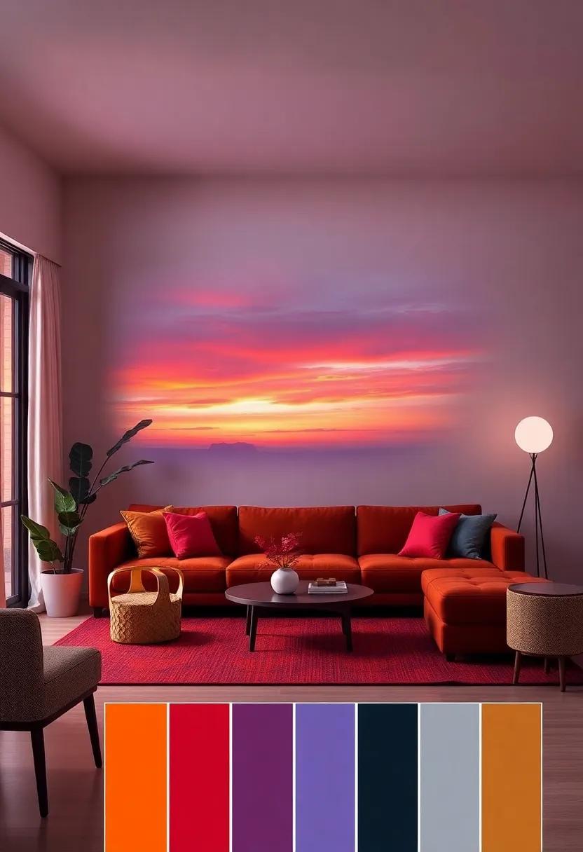 Sunset Serenade: Embrace the drama of dusk with rich oranges, twilight purples, and dusky blues for a captivating living room experience