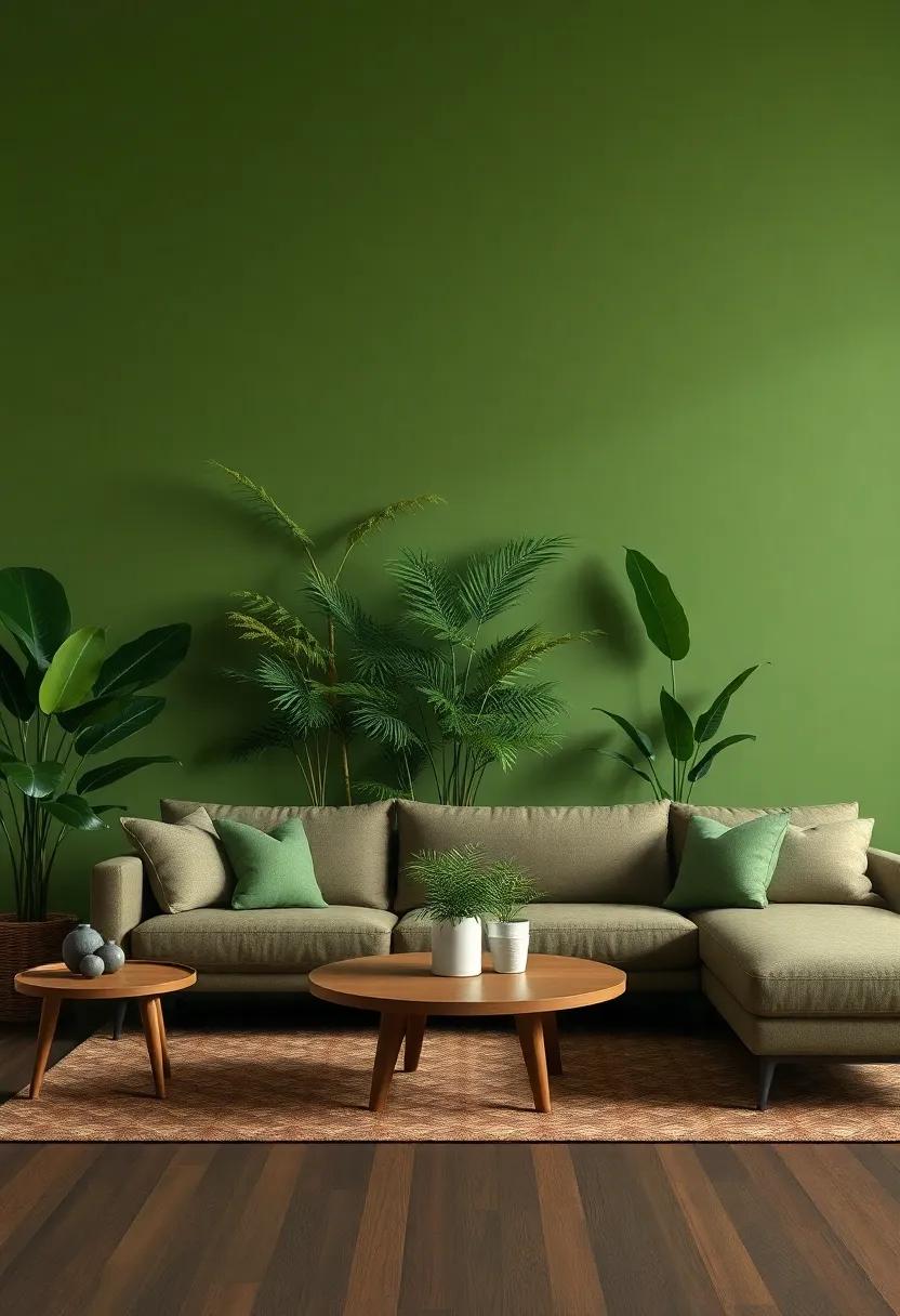 Imagine stepping into a world where earthy greens bloom like lush canopies overhead, warm terracotta embraces you like a cozy hug, and light taupe grounds your space with a tranquil touch. This color palette recalls the heart of the forest, inviting the serene escape of nature right into your living room. Consider painting your walls in a soft taupe that provides a gentle backdrop, allowing the vibrant greens of your plants and decor to pop. Accent pieces in terracotta—such as vases, ottomans, or clay lamps—add a personal touch, harmonizing beautifully with the muted, natural shades.