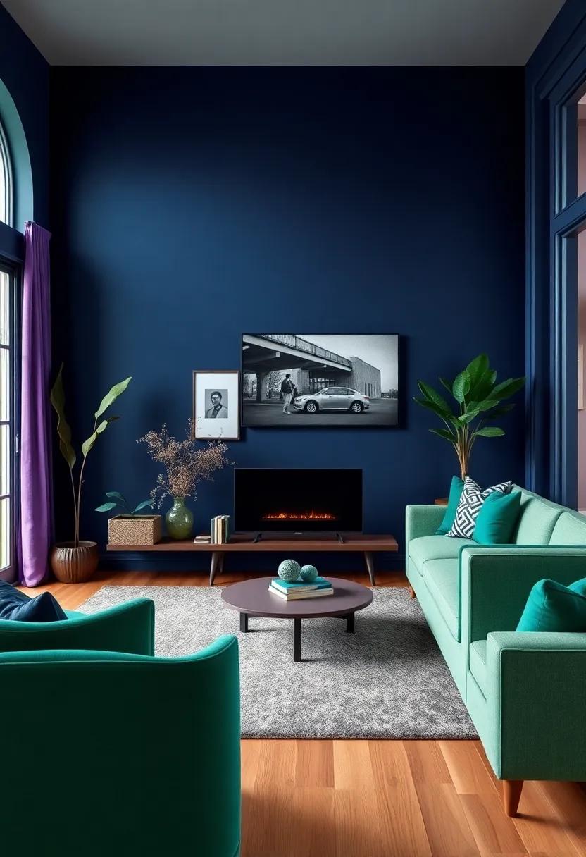 - Couches: Choose a deep navy sofa paired with coral and lilac throw pillows.