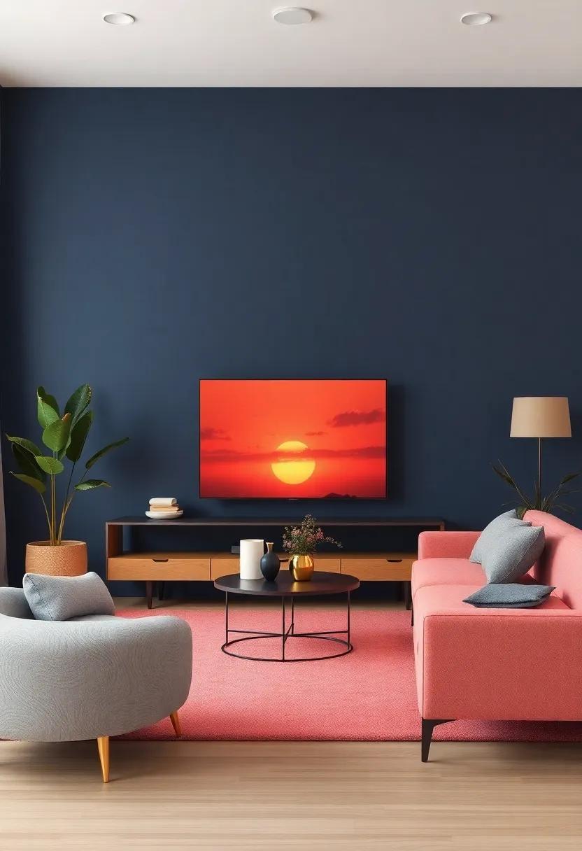 Sunset Boulevard: Capture the essence of a golden hour with warm coral, soft lilac, and deep navy for a dramatic yet cozy setting