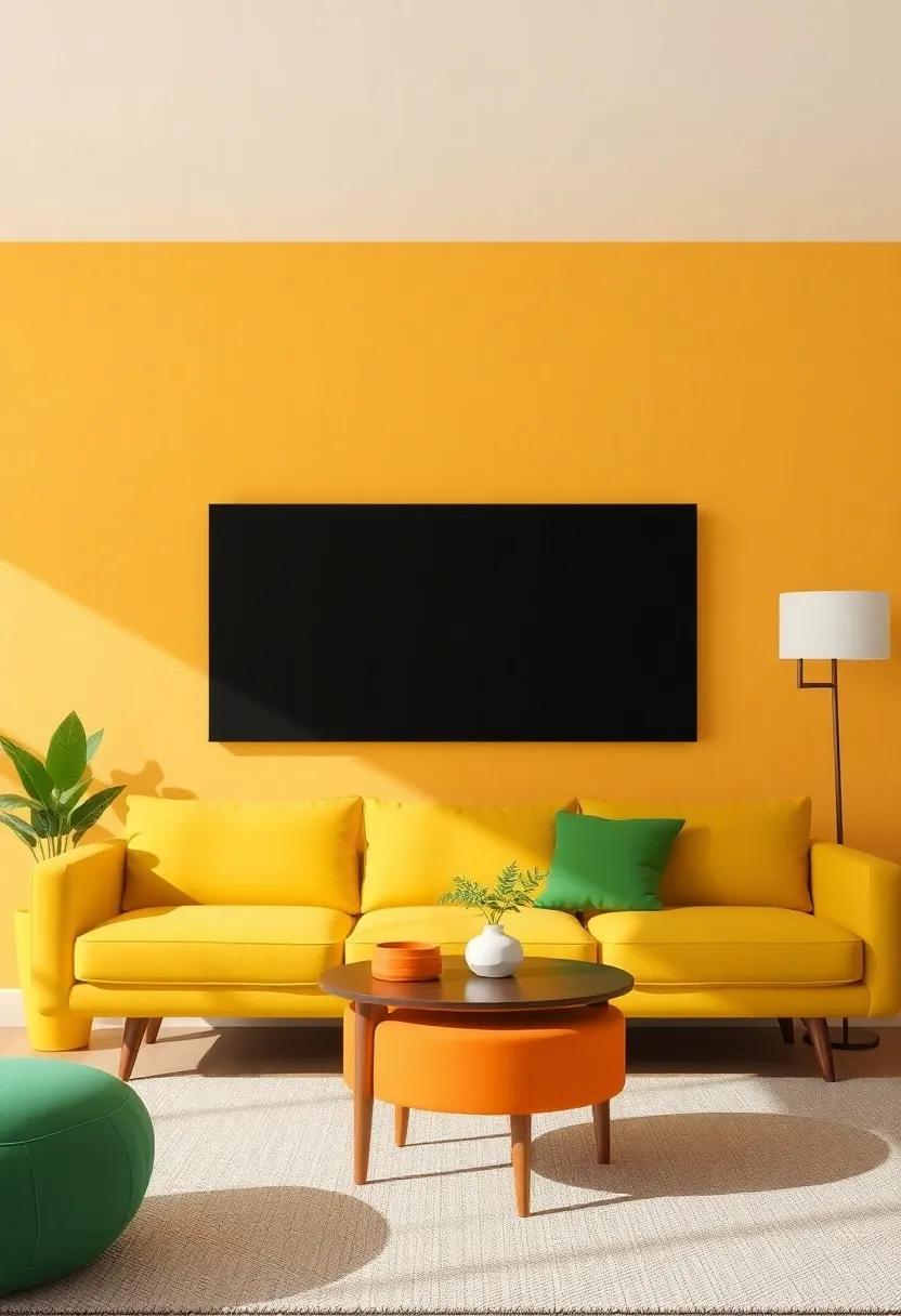 Bright citrus: Infuse energy into your living room with zesty lemon yellow, lime green, and tangy orange for a vibrant, fresh atmosphere