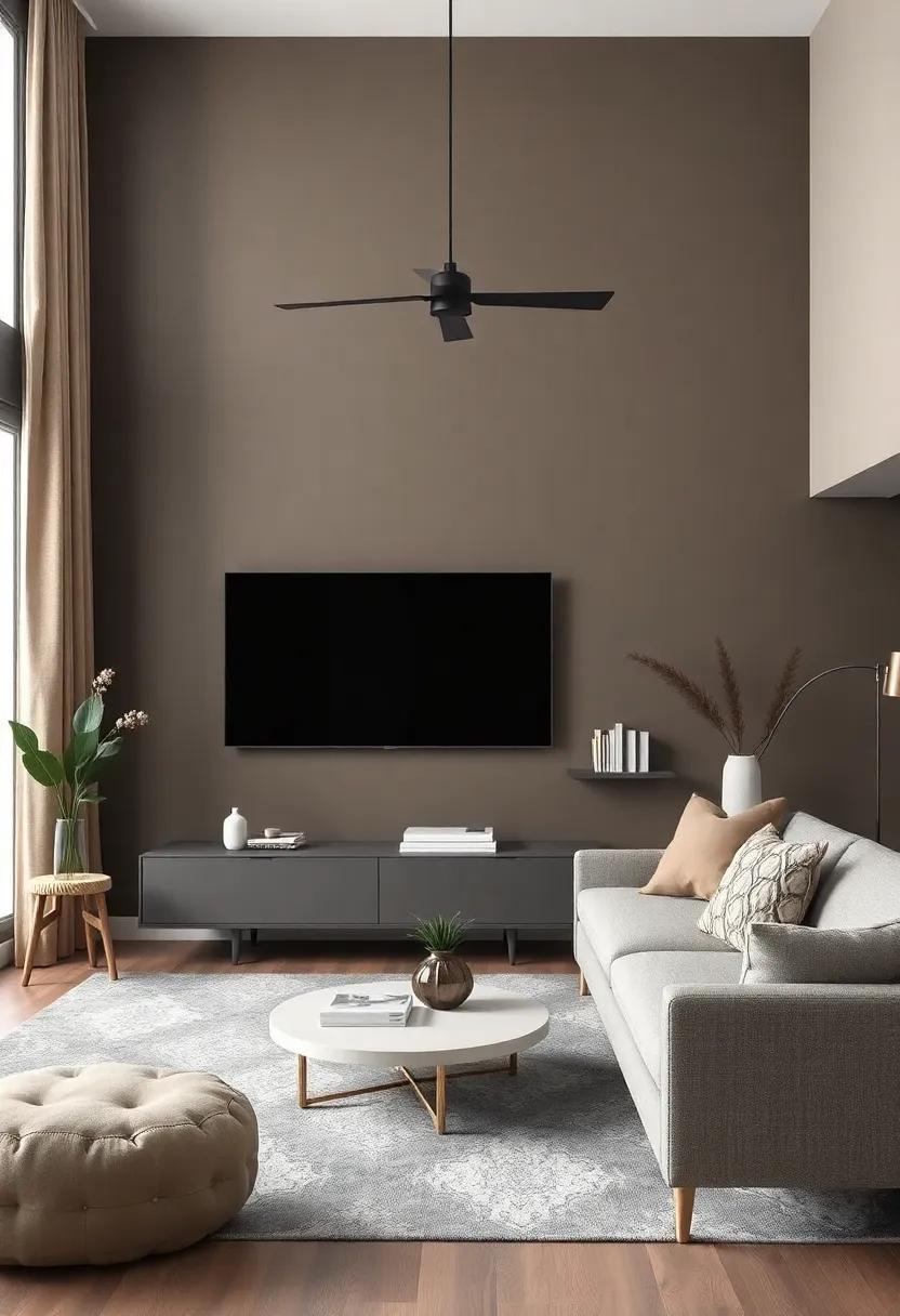 Imagine a living room drenched in dark charcoal, where the walls echo the depth of midnight, grounding the space with a touch of sophistication. This rich tone serves as a dramatic backdrop, allowing the warm taupe accents — whether in upholstered furniture or soft throw pillows — to shine with a cozy, inviting glow. Layered textures in these hues create an intriguing interplay, softening the edges of the charcoal with warmth that invites relaxation while exuding a modern charm.