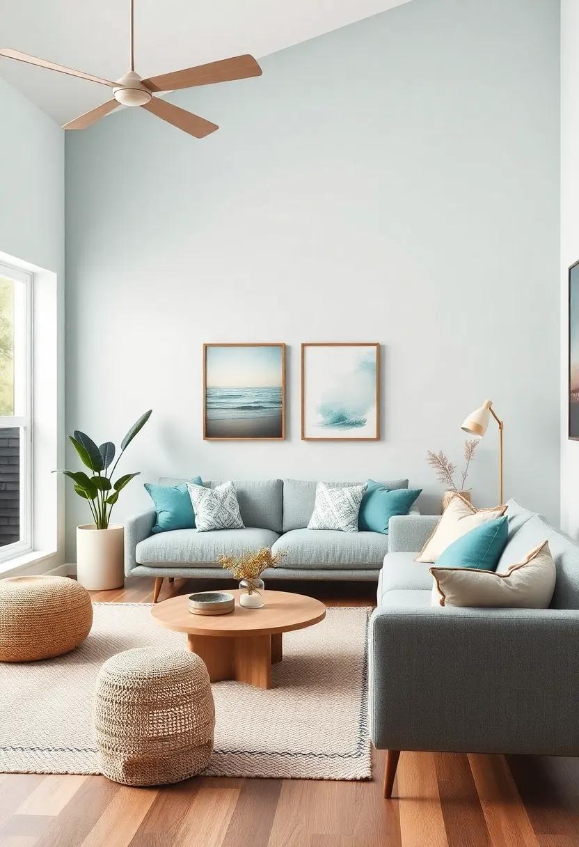 The crisp white elements serve as luminous accents that elevate the overall ambiance, allowing natural light to dance through the room. Think of white sheer curtains billowing gently or decorative throw pillows brightening a muted sofa. To further enhance this nautical theme, consider adding coastal-inspired décor: seashells, driftwood art, and ceramic pieces in matching hues. The result is a harmonious, airy living room that invites comfort and a relaxed coastal vibe.