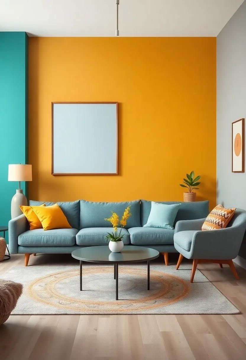 Imagine stepping into a living room that exudes both modernity and nostalgia with a stunning fusion of hues. The vibrant contemporary teal serves as a striking base, inviting energy and a sense of calm. It provides a refreshing backdrop against which your vintage mustard accents pop, bringing warmth and a touch of whimsy. The warm gray elements subtly anchor the palette, allowing you to play with patterns and textures without overwhelming the senses. Together, these colors create a harmonious balance that celebrates individuality and invites creativity in your decor choices.