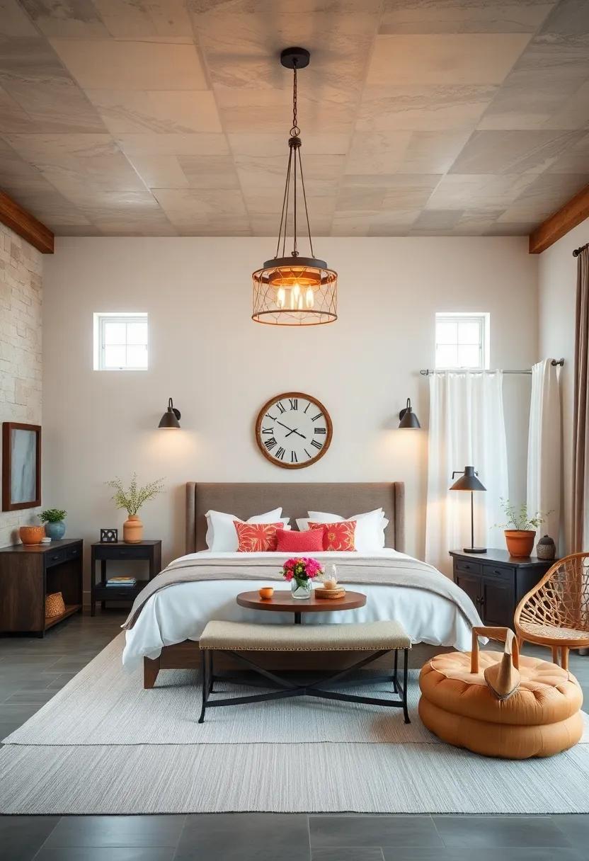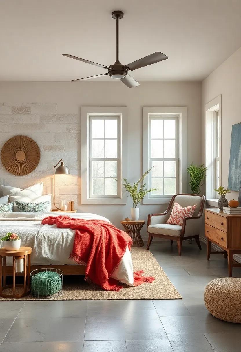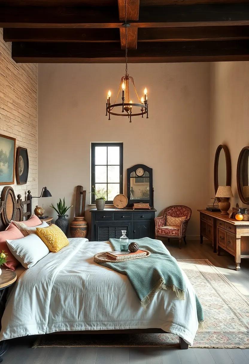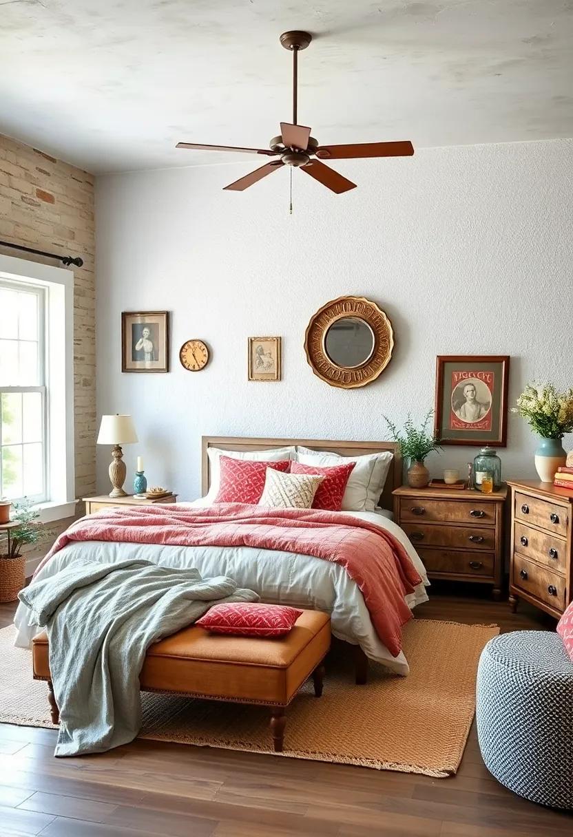 Consider including handcrafted wicker chairs that offer a cozy reading nook alongside your bedside table or a vintage nightstand crafted from reclaimed wood, giving the room an earthy, grounded feel. Opt for floral-patterned cushions on your bed that nod to classic farmhouse aesthetics.Mixing and matching these items can create a layered look, rich in texture and personality. you might also explore a retro bedside lamp to create soft lighting that enhances the inviting atmosphere at night. With these elements, your farmhouse bedroom will embody a unique narrative through its eclectic vintage flair.