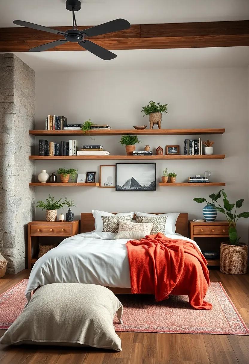 one of the easiest ways to add character and charm to your farmhouse bedroom is through carefully crafted built-in shelving. These versatile spaces can serve multiple purposes while becoming a focal point of your room.Consider using shelves to display your favorite books, plants, and decorative accents. Mixing different heights and textures creates visual interest, inviting warmth and a personal touch to your space.For example, layering a mix of succulents, framed photographs, and rustic trinkets will not only highlight your style but also break up the uniformity of larger furniture pieces.