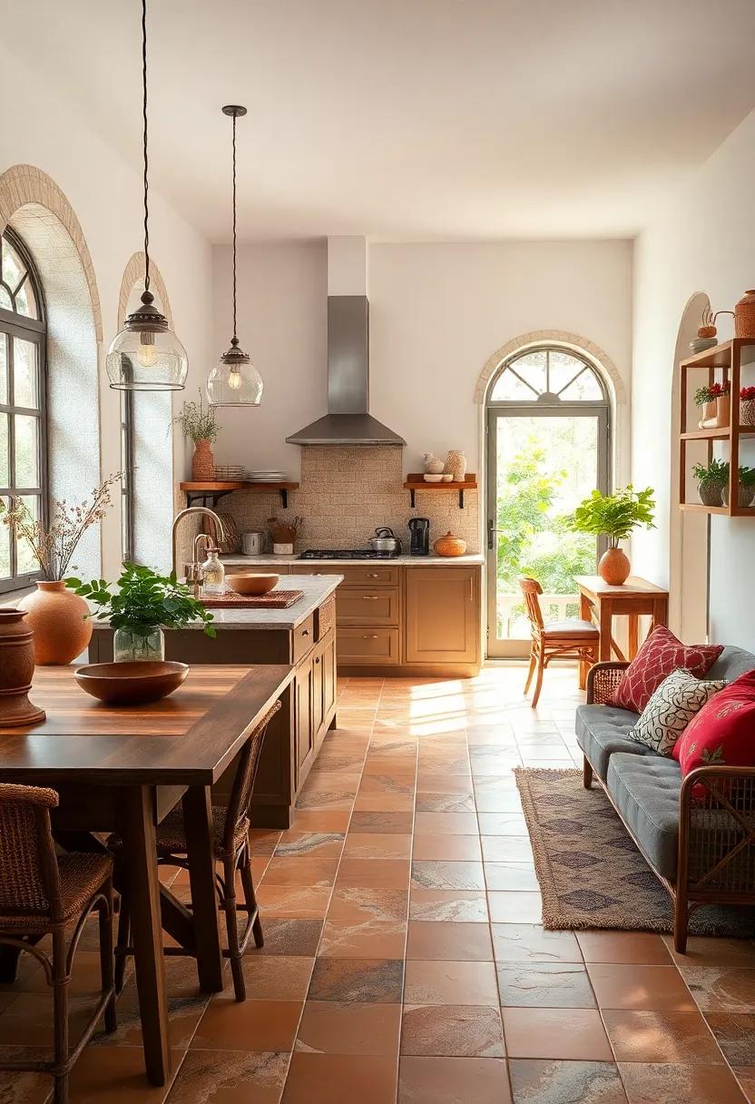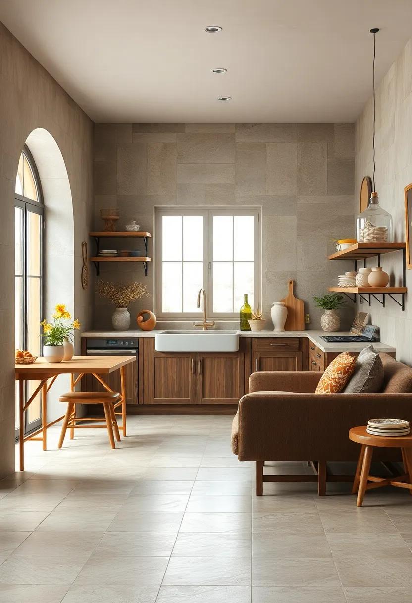 • Color Palette: Earthy tones like terracotta, muted greens, and soft grays work well with natural materials.