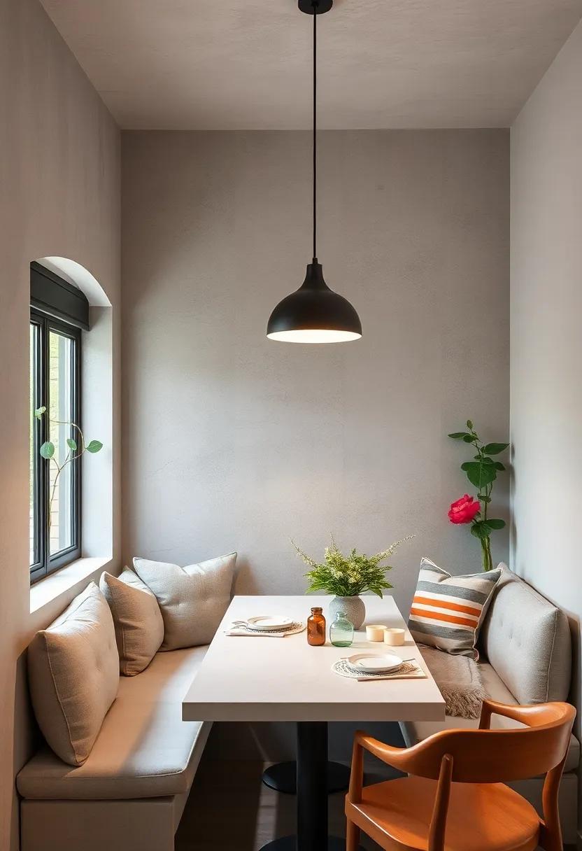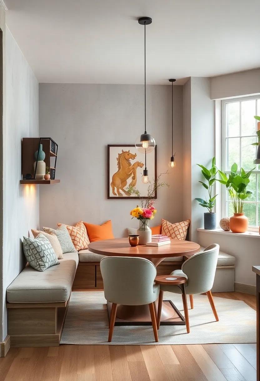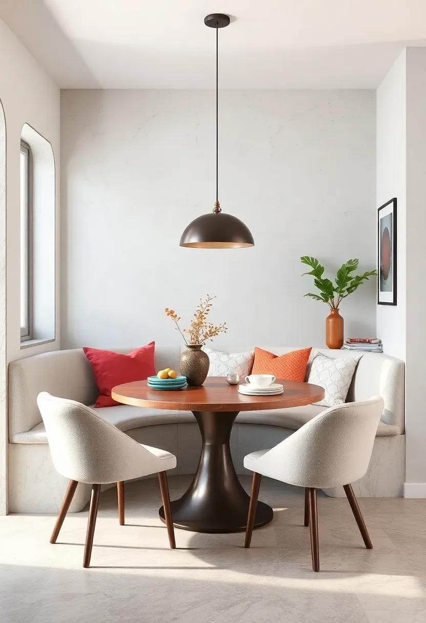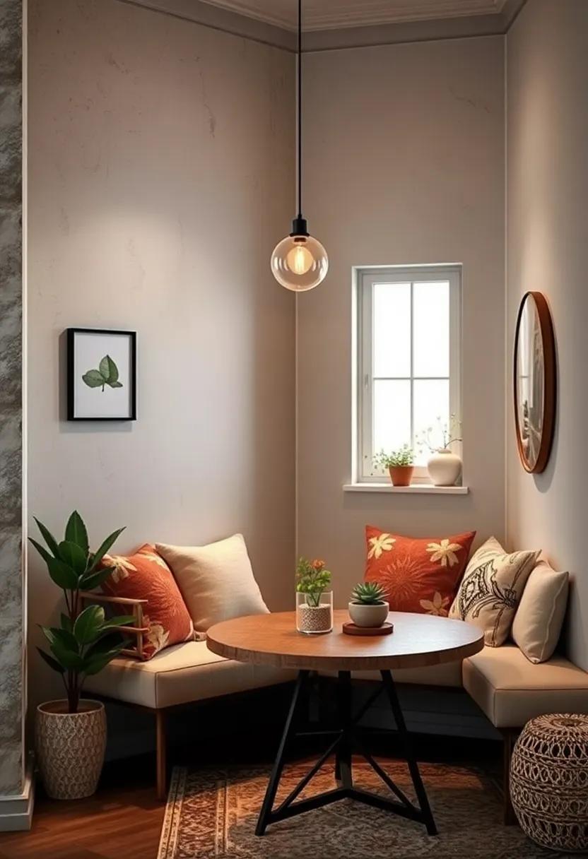 By harmonizing these elements, you can create an intimate dining area that feels spacious and stylish. Enhance your nook with subtle lighting, such as a statement pendant lamp, to draw attention to the round table while keeping the ambiance cozy and inviting.
