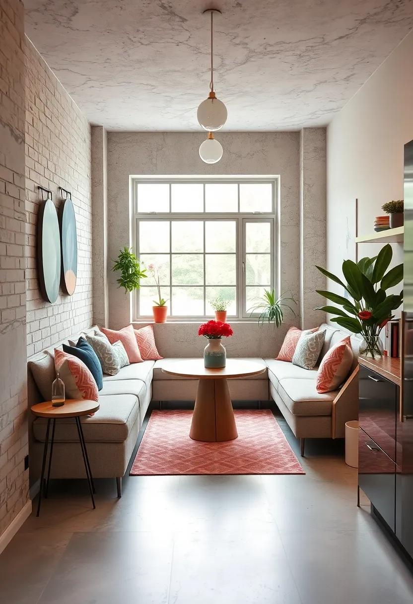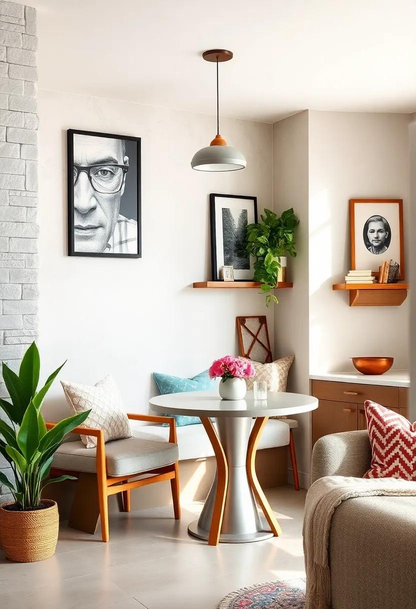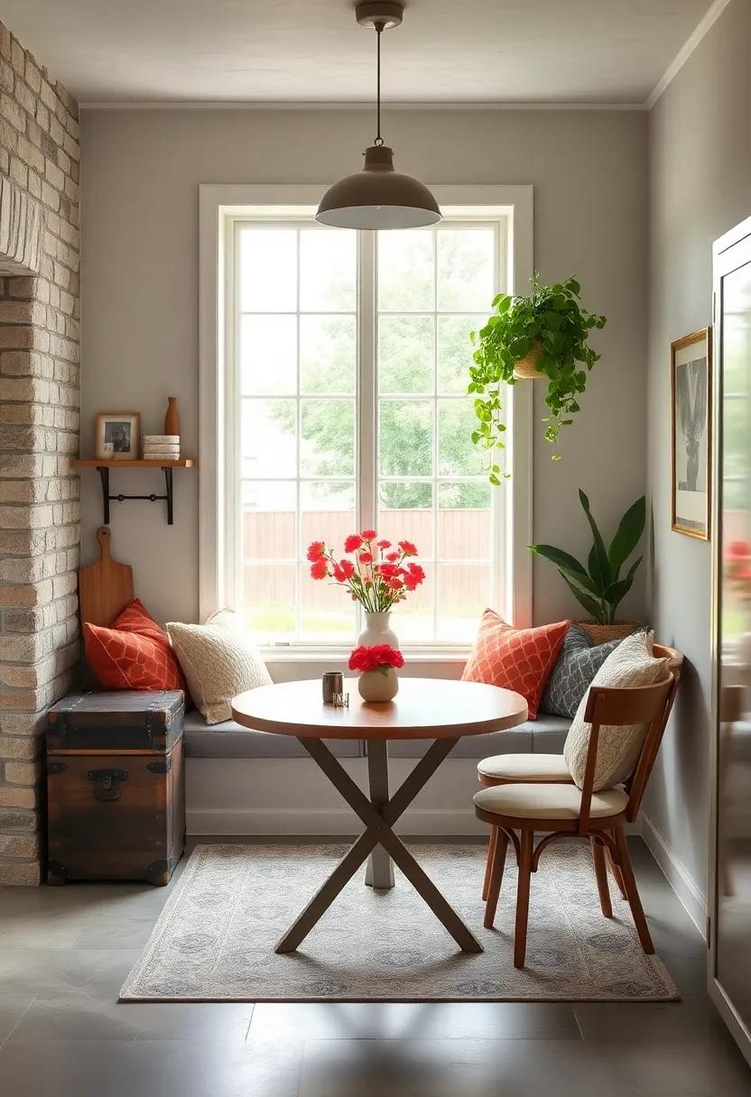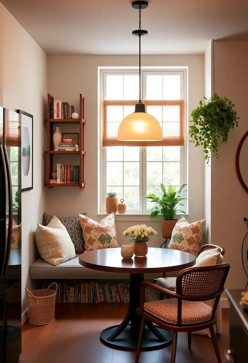 By harmonizing these elements, you can create an intimate dining area that feels spacious and stylish. Enhance your nook with subtle lighting, such as a statement pendant lamp, to draw attention to the round table while keeping the ambiance cozy and inviting.