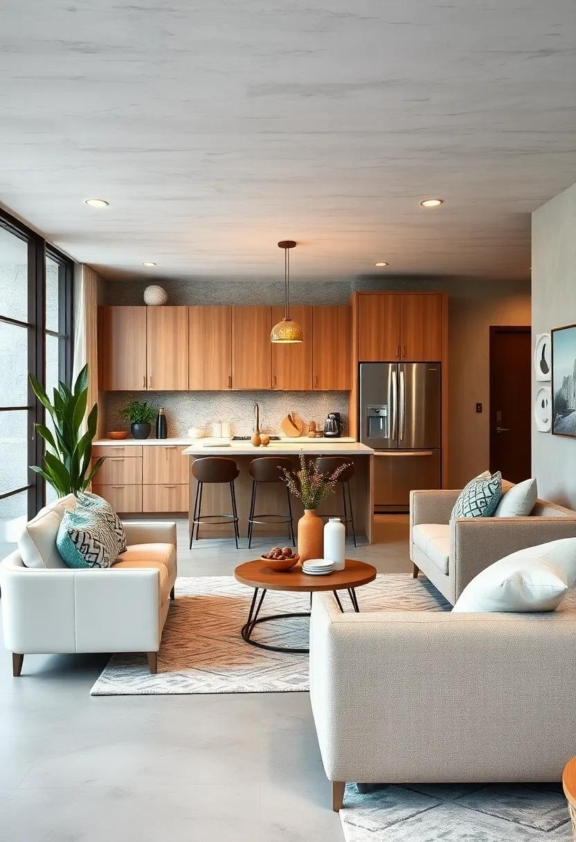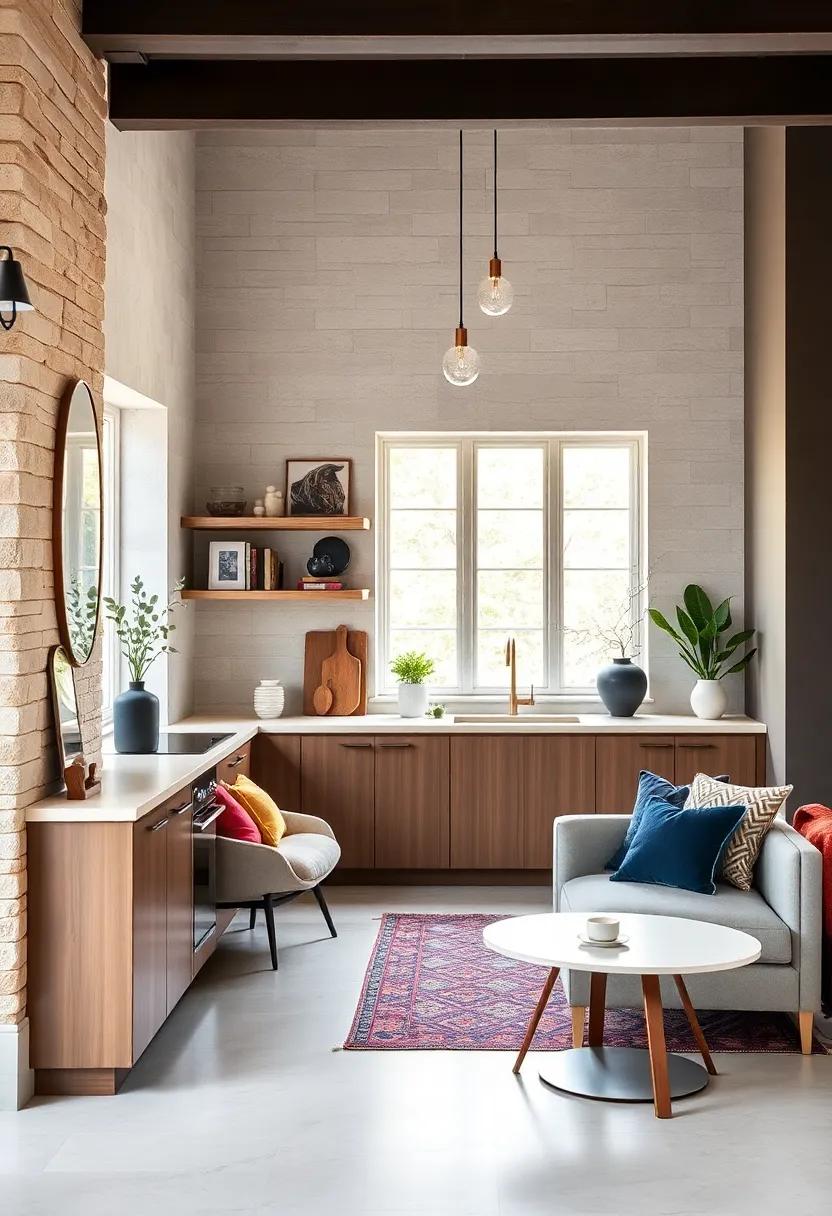 - Add Layered Lighting: Combine pendant lights over the kitchen nook with soft ambient lighting in the living area to set the mood.