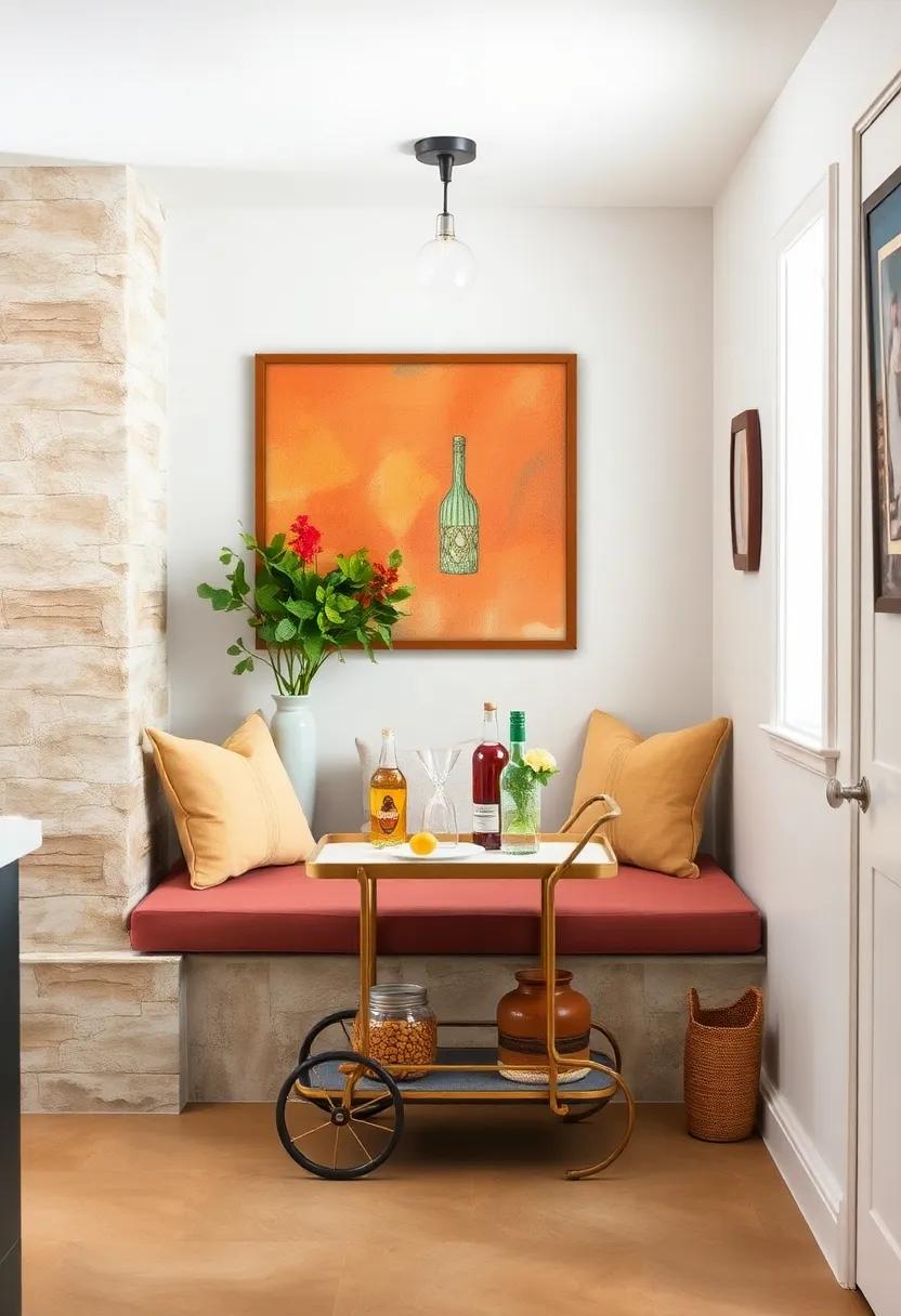 Retro Bar cart: Introduce a vintage bar cart to your nook for a stylish and functional way to serve drinks or snacks, easily movable when needed