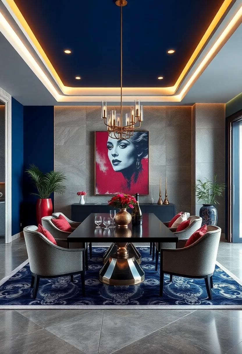 Imagine stepping into a dining room where the walls are draped in deep charcoal or rich navy, creating an atmosphere that is both dramatic and inviting. This backdrop sets the stage for vibrant accents—perhaps a radiant golden chandelier suspended overhead, or jewel-toned velvet chairs that invite you to sit and linger. The interplay of such dark hues with brighter elements conjures a scene of sophisticated opulence that captivates the senses. Elements like polished wood tables and metallic details further elevate this contrast,providing a rich textural experience that enhances the overall ambiance.