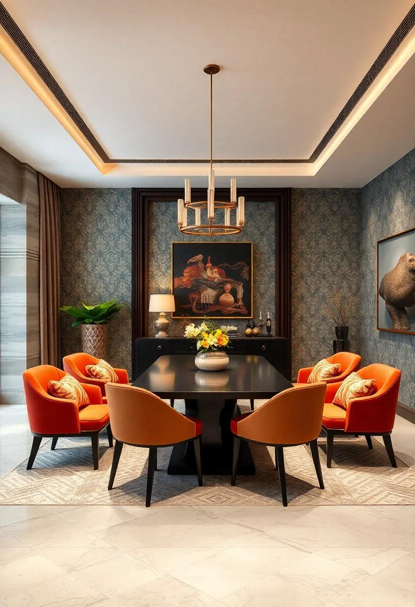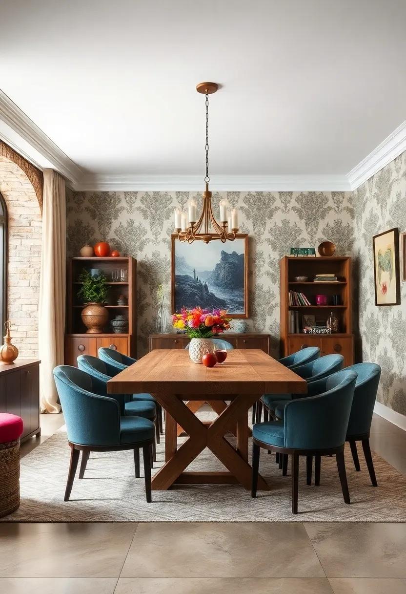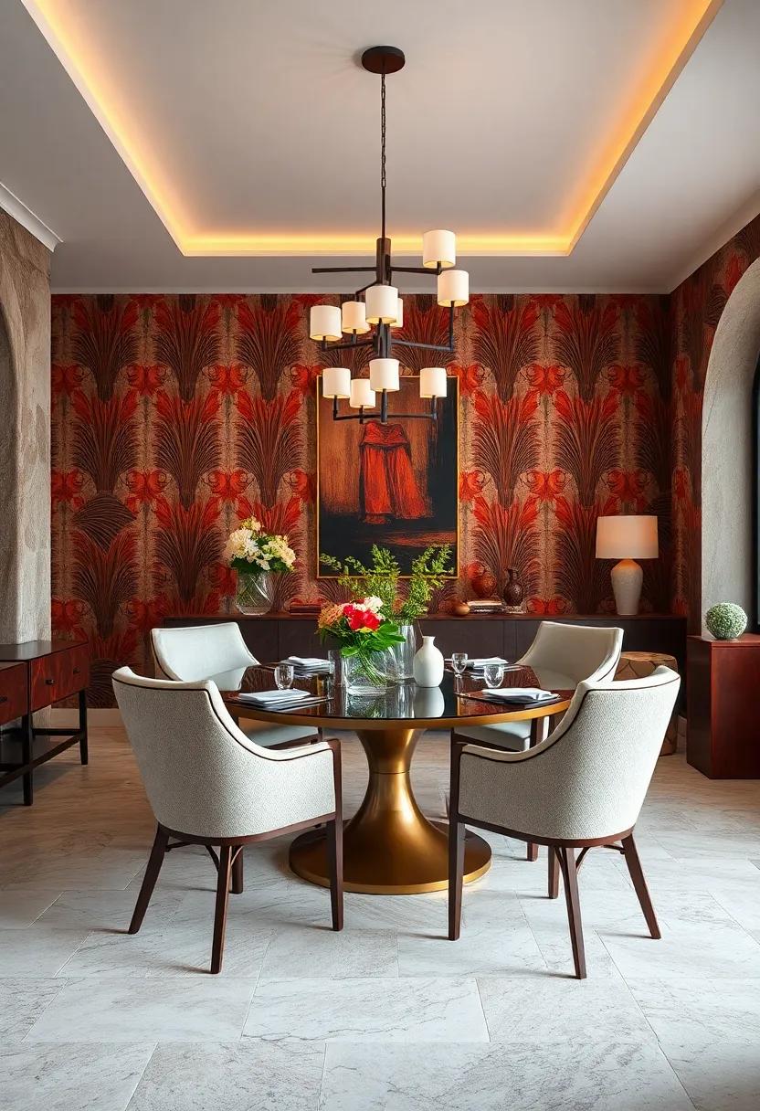 The magic of this design lies in the seamless coexistence of these contrasting fabrics and forms, all unified under the gentle glow of designer lighting. Statement fixtures, such as a contemporary chandelier or elegant pendant lamps, cast a warm ambience that enhances the bold wallpaper and eclectic elements. This interplay of light and style invites gatherings, making meals feel like special occasions. The intricate layering can be beautifully summarized in the following table, showcasing the elements that breathe life into this extraordinary setting: