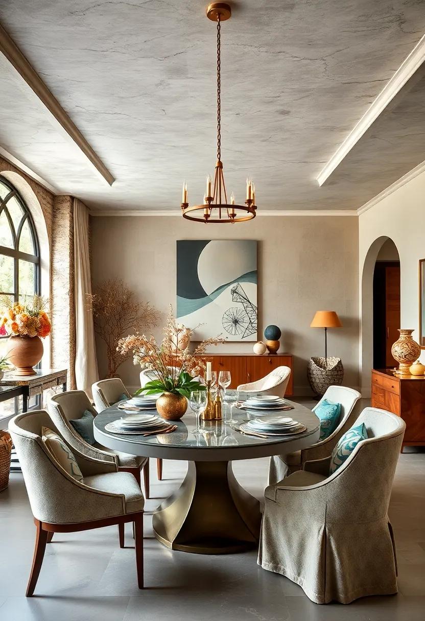 Step into a dining room where the past and present collide in a symphony of textures, colors, and styles.The bold use of vintage furniture — think a regal chandelier paired with a rustic farmhouse table — sets a stunning contrast against contemporary art pieces adorning the walls. each chair, with its unique upholstery, invites conversation while showcasing an array of patterns and fabrics, from rich velvets to airy linens. Here are some carefully selected elements that contribute to the room’s distinctive character: