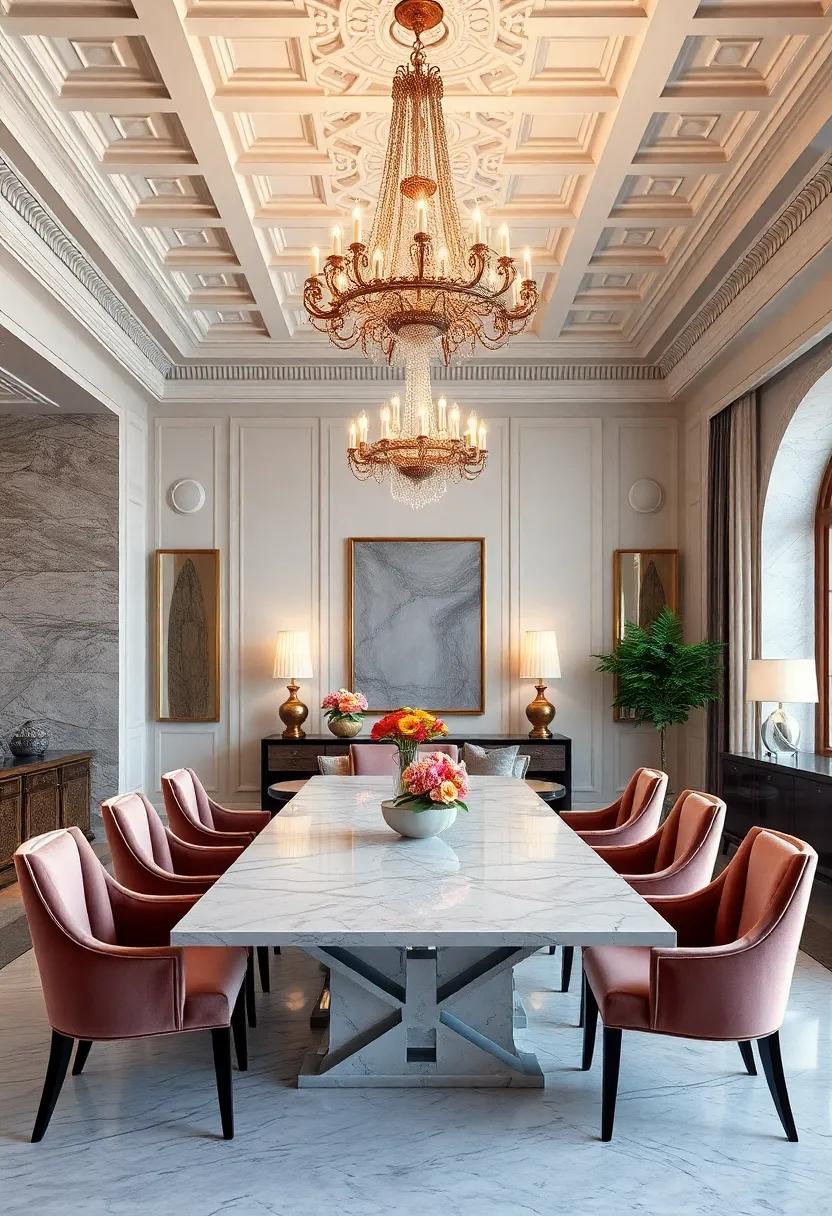 Every detail in this exquisite setting speaks to sophistication, highlighting a seamless interplay between texture and form. The luminous warmth of the chandelier enhances the rich tones of the marble, while the velvet’s softness invites guests to linger longer. Pairing classic elements with contemporary design,this room embodies a timeless elegance that is both inviting and impressively grand.The careful selection of colors—deep greens, opulent golds, and muted neutrals—adds depth and allows for personal touches, making each dining experience uniquely memorable.
