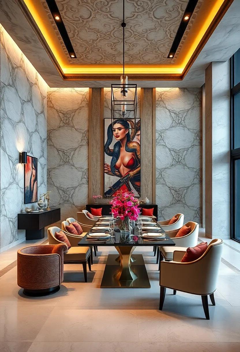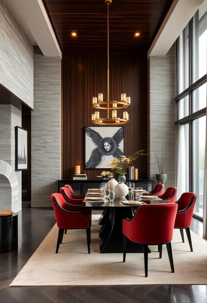 At the heart of this sophisticated setting lies a statement piece of abstract art, anchoring the room and captivating the attention of every guest.Its vibrant splashes of color can echo the deep hues of the room,seamlessly integrating with the overall design while providing an artistic focal point. Minimalist decor surrounding the artwork allows for the art to truly shine, providing the perfect counterbalance to the richness of the colors. Consider the use of streamlined furniture and geometric shapes, which add to the dining area’s modernity without overwhelming the artistic expression. Each element is thoughtfully curated, crafting a refined space where design and dining converge beautifully.
