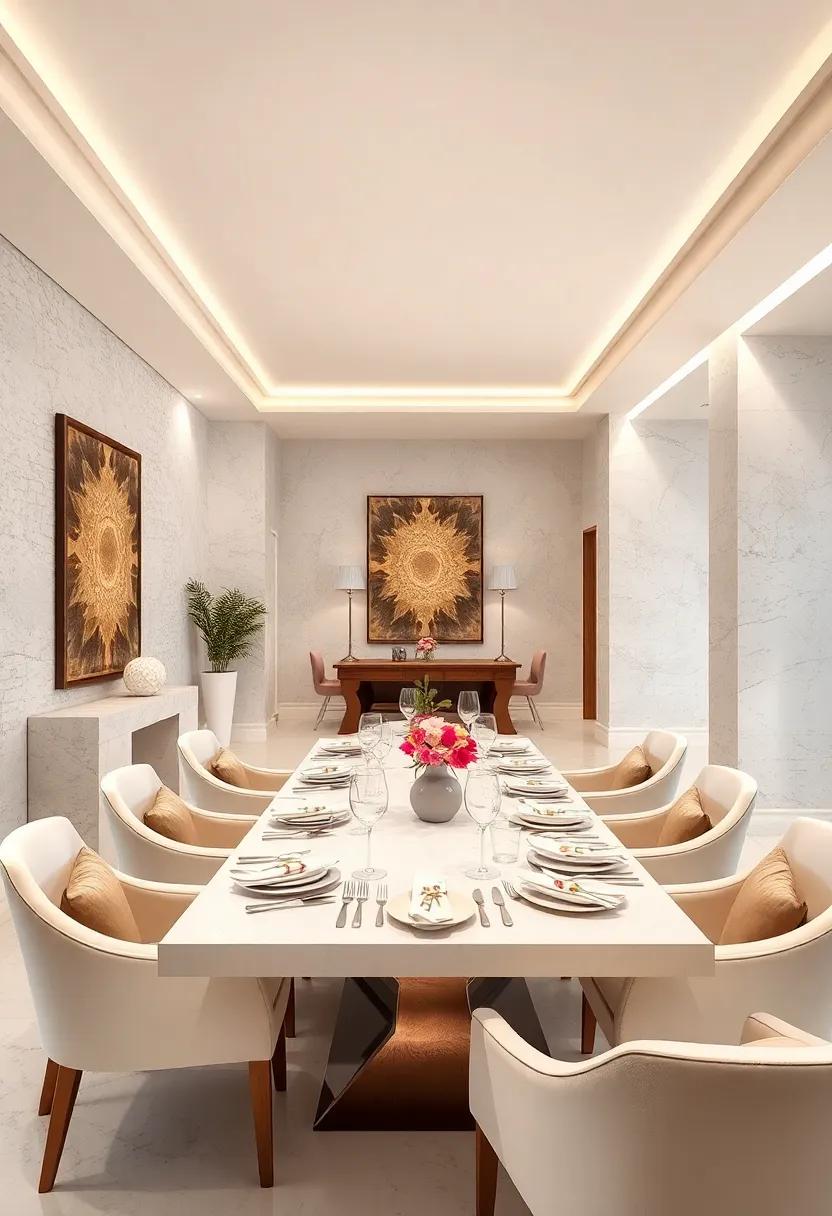 These thoughtful touches add personality and charm without disrupting the serene palette. Lighting plays a pivotal role as well; consider a grand chandelier with a soft, diffused glow to create intimacy, or pendant lights that echo the materials used in your furniture. By embracing these dynamic layers and textures within a neutral framework, a dining room can transform into a sophisticated enclave that captivates all who enter.