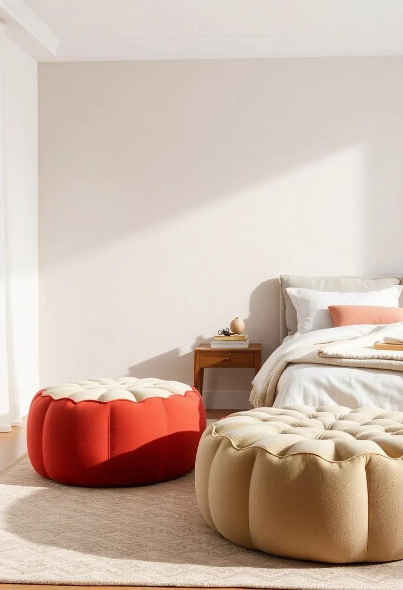 Elegant Poufs – Use stylish poufs as extra seating or footrests that introduce texture, color, and comfort to your bedroom without overspending