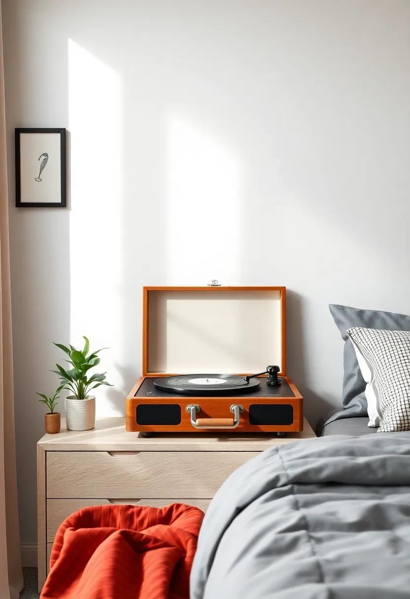 Vintage-Inspired Bedside Record Player – Combine nostalgia with modern decor by featuring a vintage-inspired record player that pleasantly surprises your guests
