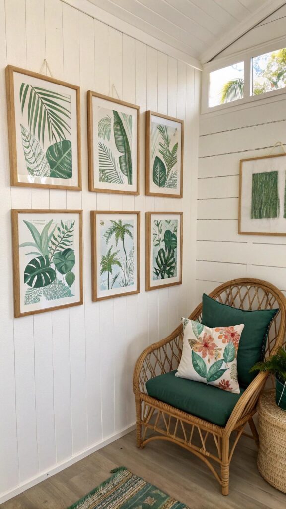 Consider crafting a gallery wall combining patterned tropical prints and personal photographs, framed in rattan or bamboo to enhance the natural, summery aesthetic. This approach suits bedrooms of any size beautifully.