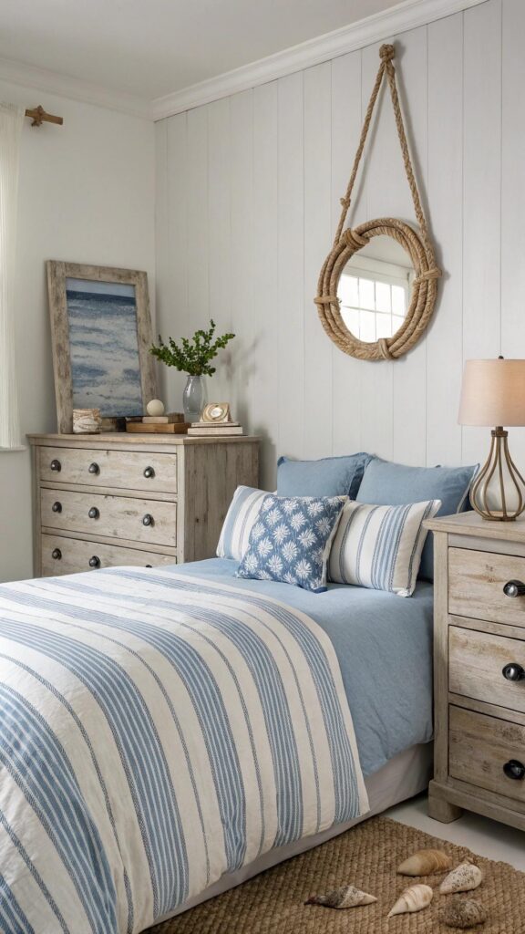 Craft a beach-inspired retreat by focusing on a palette of whites and various shades of blue. Elements like striped bedding, nautical-themed accessories, and pieces made from driftwood evoke the soothing spirit of the seaside.