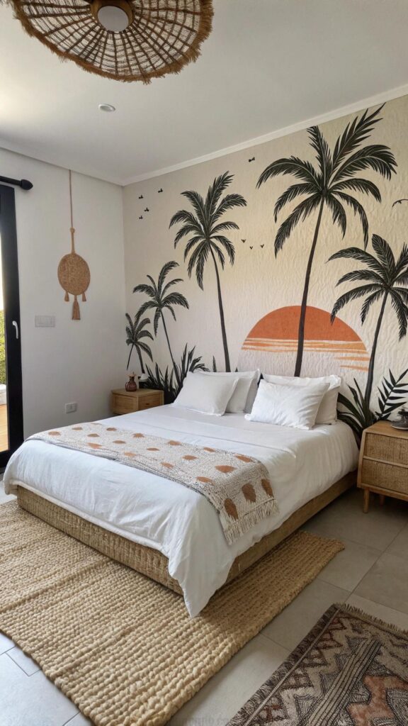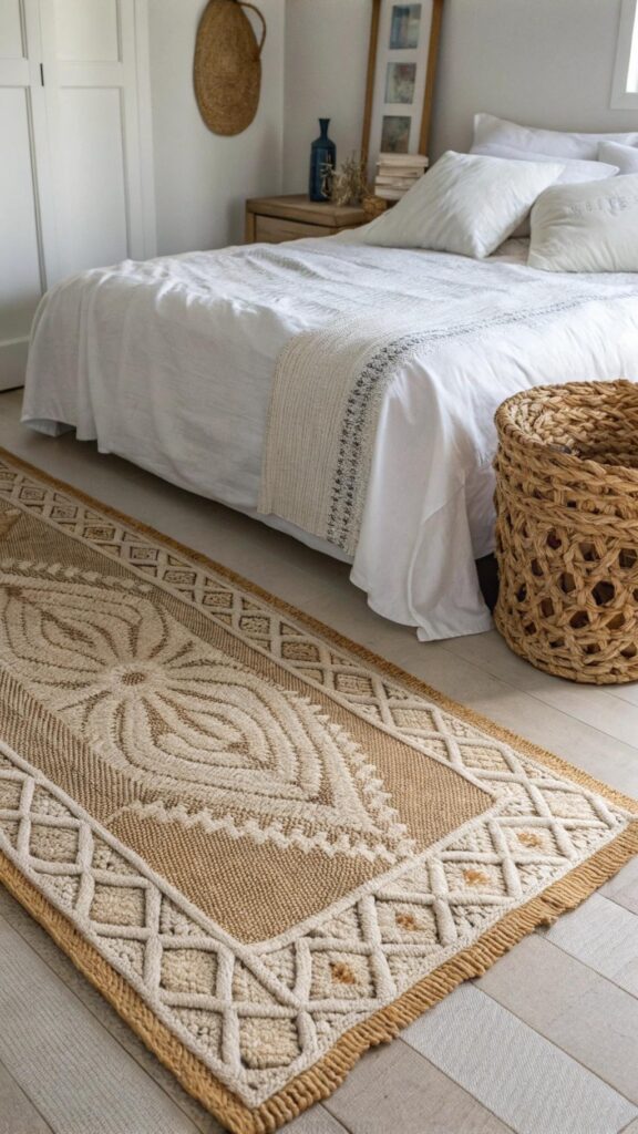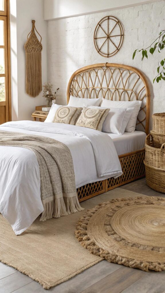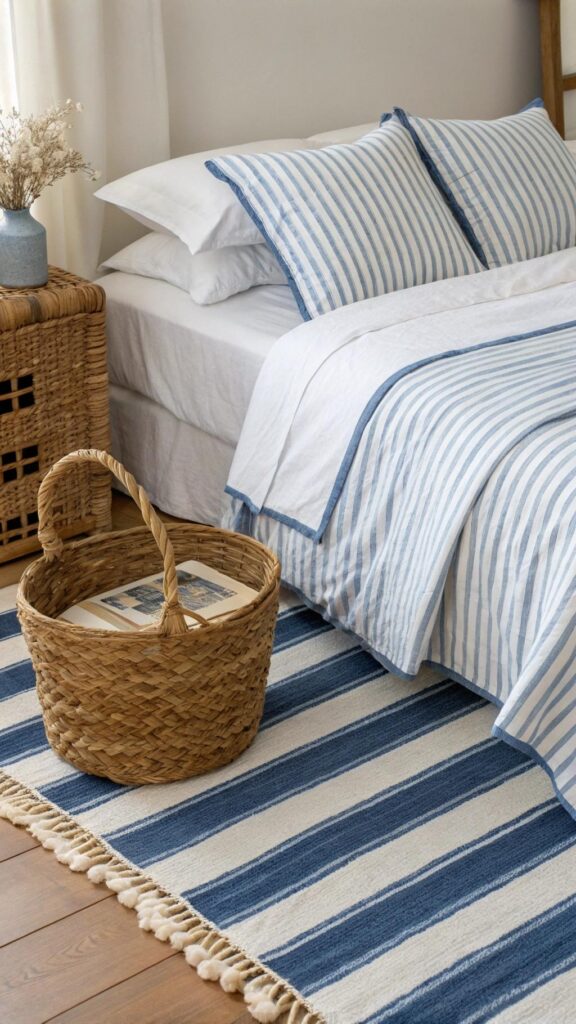 Integrate textures like seagrass, rattan, and jute to bring an organic, earthy vibe into your bedroom. Consider a rattan headboard, a jute area rug, or woven baskets for functional styling. These elements blend rustic appeal with summer freshness.