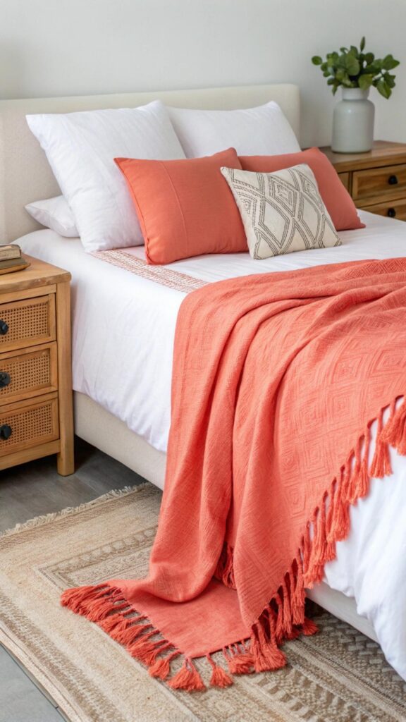 Introduce a splash of lively color with throw blankets in coral red, turquoise, or sunshine yellow. These items not only brighten the bed but also provide a cozy layer on cooler summer evenings.
