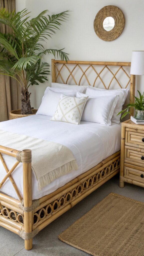 Bamboo furniture offers an eco-friendly, lightweight option to infuse warmth and texture into your bedroom. Whether a bedframe, nightstand, or wardrobe, bamboo’s natural tones blend effortlessly with greenery and light fabrics.