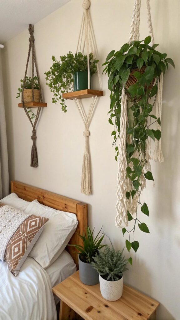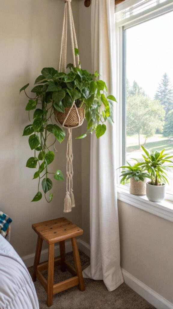 Elevate your bedroom ambiance by adding hanging plants, which are excellent for small spaces. Opt for easy-care varieties such as pothos, string of hearts, or spider plants to purify the air and boost mood.