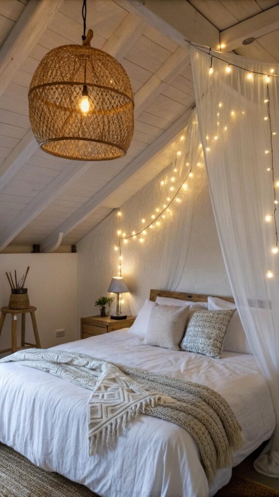 Accentuate with fairy lights for a magical, cozy atmosphere that transforms your bedroom into a summer sanctuary.
