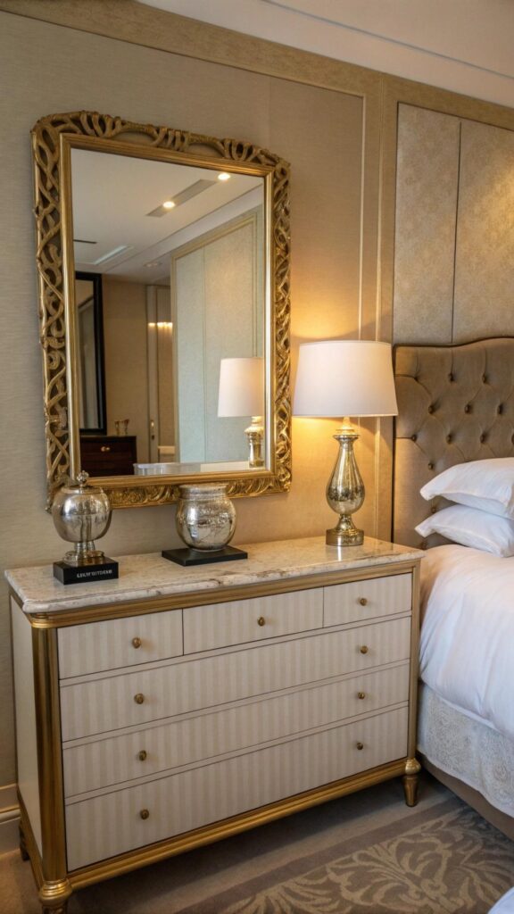 Inject subtle luxury with metallic accents in gold, copper, or silver. Think statement lamps, framed mirrors, or decorative trays that catch and amplify light to enliven the space.