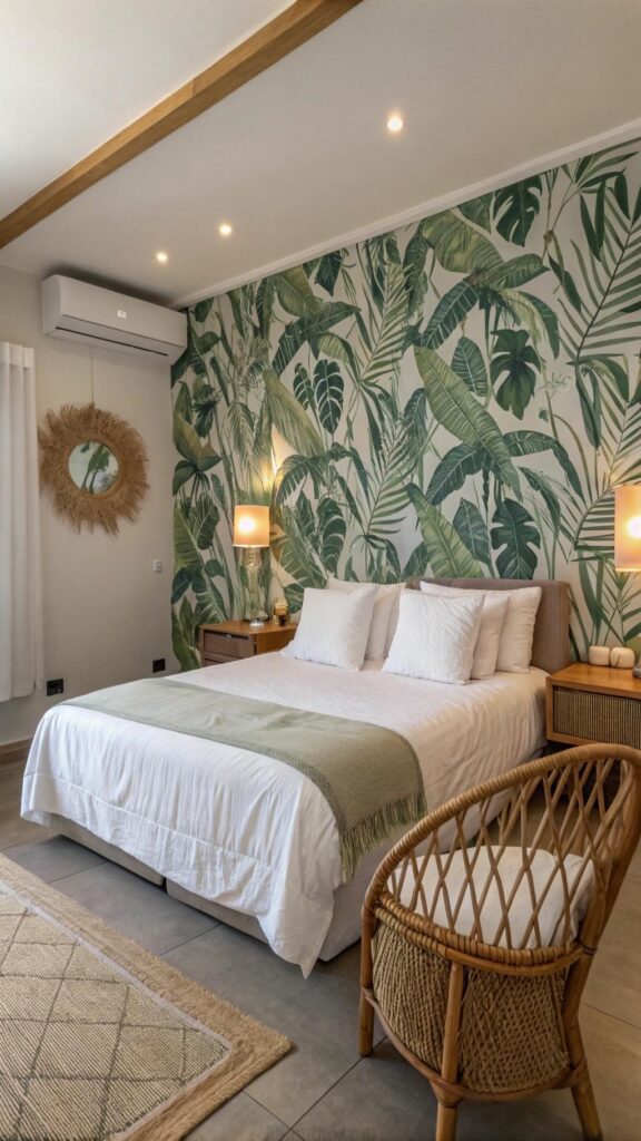 Introduce a summer-inspired bold wallpaper featuring tropical foliage, geometric patterns, or floral designs to inject character into one accent wall. This creates a striking backdrop without overwhelming your room.
