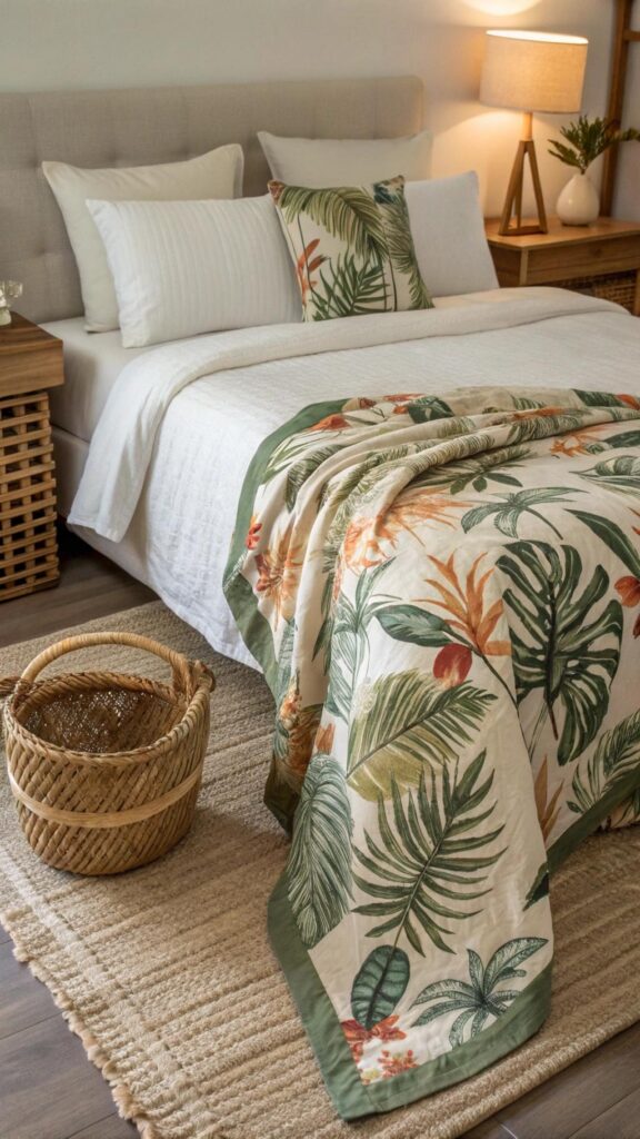 Introduce tropical or geometric patterned throw blankets, ideal for layering on your bed or draping over a chair. These provide both warmth for balmy nights and a touch of visual interest.