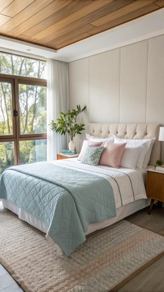 Complement your sheets with a lightweight coverlet in neutral shades, accented by throw pillows showcasing playful motifs like chevrons or botanical prints. This effortless refresh instantly brightens and elevates your bedroom’s vibe.