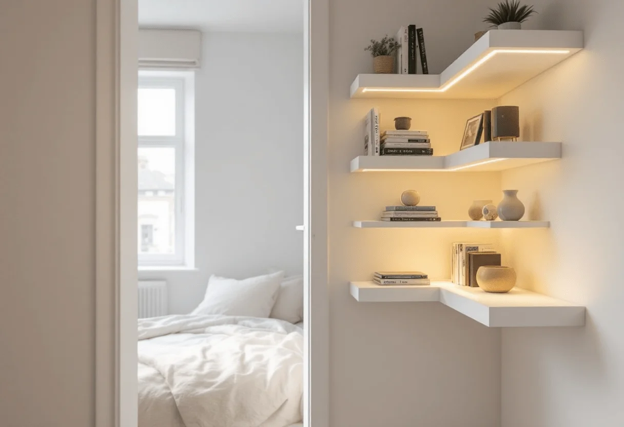Often overlooked in bedroom layouts, corners hold untapped potential. Fitting elegant, L-shaped floating shelves embedded with warm, concealed LED lighting transforms these nooks dramatically. By adding vertical storage that emits a soft glow, you eliminate the need for clunky lamps and infuse your room with an upscale, calming vibe.