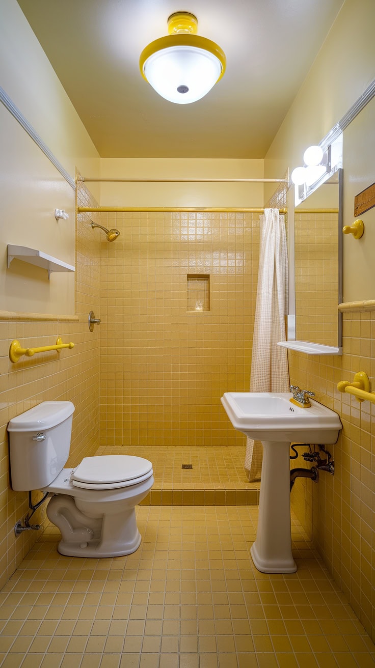 Basking in warmth, this yellow tile bathroom champions a lively retro vibe with its cheerful floor-to-fixture tiles set against crisp white walls. Playful yellow accents inject personality, making it a prime reference for stylish yet functional apartment bathrooms.