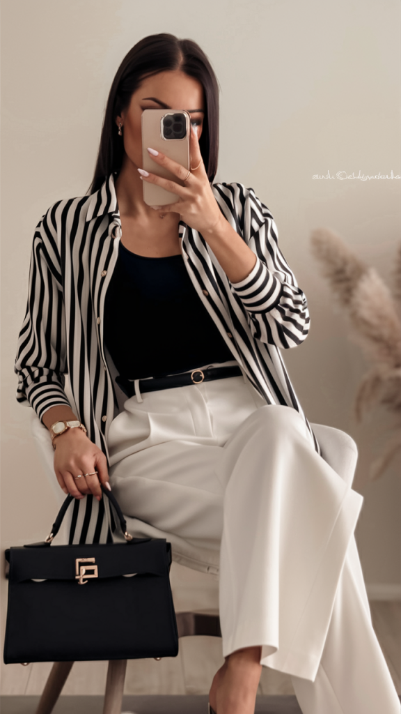 Featuring a striking black-and-white striped shirt paired with pristine white wide-leg trousers, this outfit delivers vivid impact while remaining professional. Accessories include a black handbag and subtle gold accents, making it ideal for days when you wish to stand out while preserving office decorum.