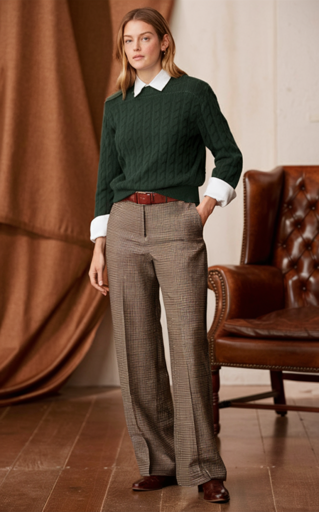 - Trousers: Wide-leg, high-waisted for flattering shape.