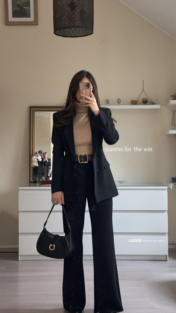 An all-black outfit radiates confidence featuring a structured blazer and high-waisted flared trousers. Paired with a beige turtleneck for warmth and contrast, gold-accented accessories and pointed-toe heels complete this commanding business look.
