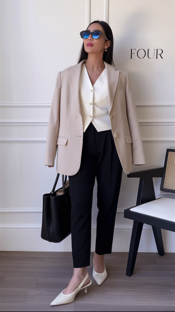 This outfit artfully balances classic elements with modern tailoring: oversized beige blazer over a white waistcoat, paired with slim black trousers. Statement oversized sunglasses bring a fashionable edge, suitable for varied office occasions.