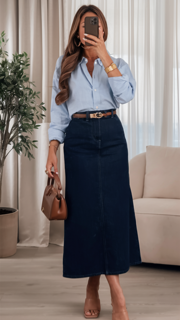 Blending the relaxed feel of denim with crisp tailoring, this ensemble strikes a perfect balance between comfort and professionalism. A high-waisted denim skirt, cinched neatly with a stylish belt, structures the outfit while preserving an easy-going vibe. Pairing it with a tucked-in pale blue shirt creates a fresh and approachable aesthetic, ideal for casual office Fridays or creative workspaces. Neutral accessories such as a tan handbag and nude heels reinforce the springtime freshness.