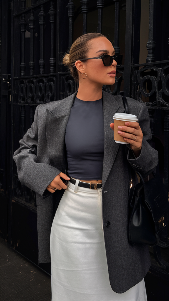 A sharp oversized blazer with a fitted pencil skirt in white offers a feminine yet assertive look, enhanced by black leather belts and accessories. Optimal for formal meetings or evening events.
