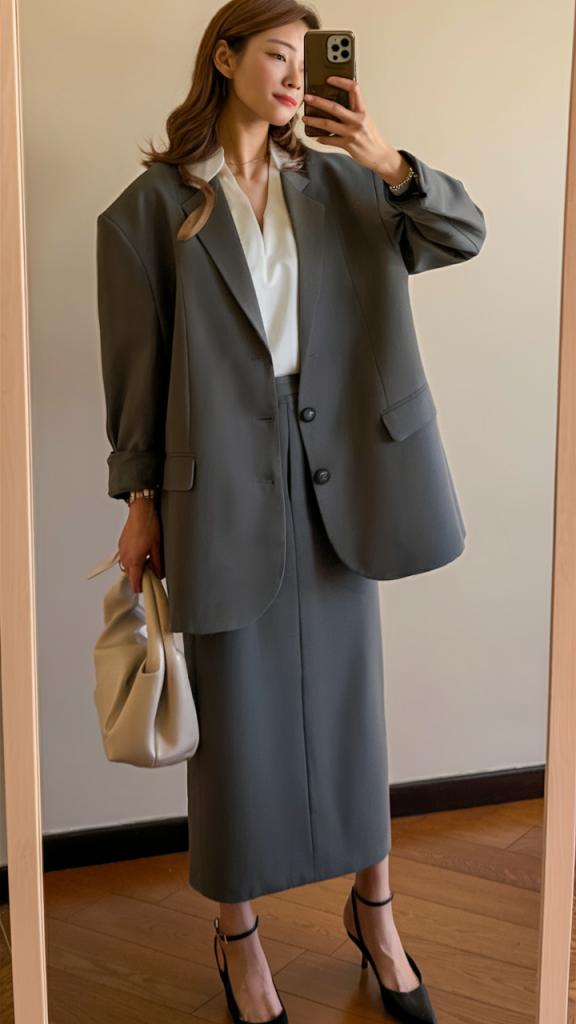 Modern corporate elegance shines in this oversized blazer and midi skirt set in grey, complemented by a soft white blouse. Subtle accessories like a beige pouch and fine jewelry complete the look, perfect for executive settings.