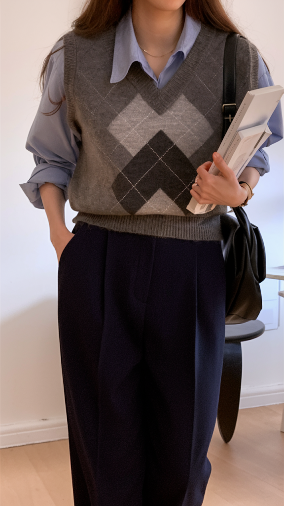 A collegiate-inspired aesthetic featuring a grey argyle sweater vest over a crisp blue button-down shirt, paired with pleated navy high-rise trousers, creates a polished office look ideal for casual business environments or academia.