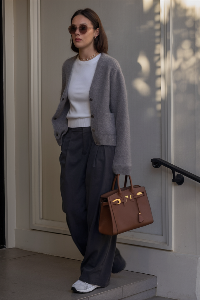 Wide-leg navy trousers and a cropped grey cardigan paired with a basic white tee create a laid-back professional look. A cognac leather structured handbag and white sneakers lend casual sophistication suitable for creative roles.